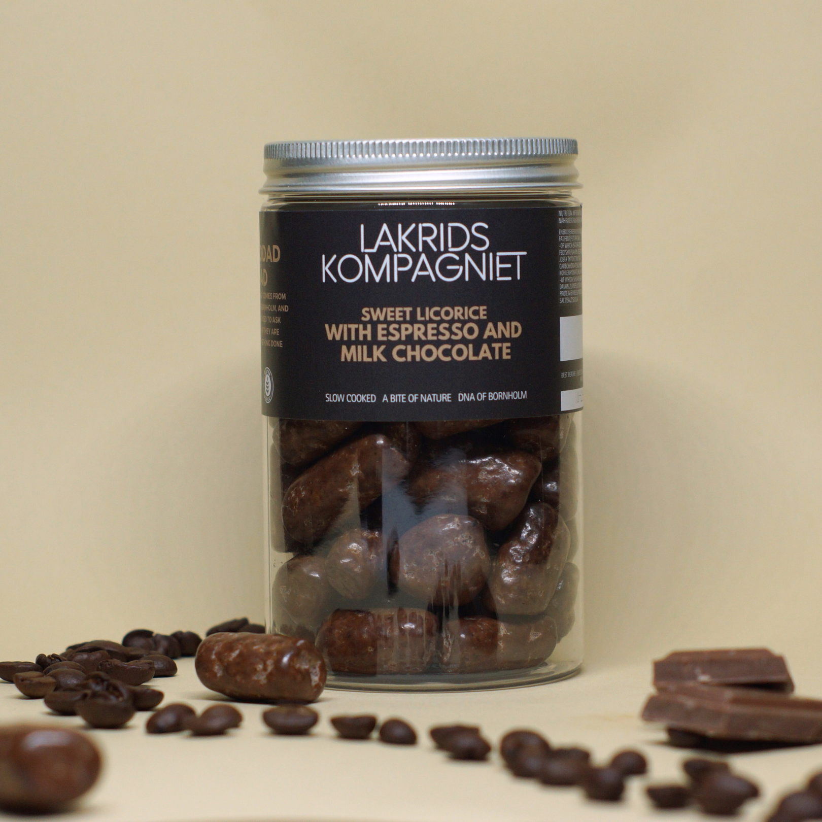 INGREDIENSER/INGREDIENTS: 47% MÆLKE CHOKOLADE/47% MILK CHOCOLATE (SUKKER/SUGAR, KAKAOSMØR/ COCOA BUTTER, SØDMÆLKSPULVER/ WHOLE MILK POWDER, KAKAOMASSE/COCOA MASS, KAKAOPULVER/ COCOA POWDER, EMULGATOR/EMULSIFIER: SOJALECITIN/SOY LECITHIN, NATURLIG VANILJE AROMA/ NATURAL VANILLA FLAVOUR, E501) RISMEL/RICE FLOUR, INVERTSUKKERSIRUP/ INVERT SUGAR SYRUP, GLUKOSESIRUP/GLUCOSE SYRUP, SUKKER/SUGAR, MOLASSES, 3,6%RÅLAKRIDS (IKKE-EU)/ 3,6% RAW LIQOURICE(NON-EU), STABILISATORER/ STABILIZERS: E420, 1,6% KAFFE/1,6% COFFE, RAPSOLIE/ RAPESEED OIL, HAVSALT/ SEASALT, STABILISATORER/ STABILIZERS: E412, JOHANNESBRØDKERNEMEL/CAROB SEED FLOUR, ANISOLIE/ANISE OIL, MAJSSTIVELSE/CORN STARCH, FARVE/COLOR: E153, GLYCEROL, E500, HUMLEEKSTRAKT/HOPS EXTRACT, PROPYLEN GLYCOL, E172, E555, E535, KONSERVERINGSMIDDEL/PRESERVATIVE: E414, VEGETABILSK OLIE/VEGETABLE OIL, E200, E330, KALIUMSORBAT/POTASSIUM SORBATE, SVOVLDIOXID/ SULFUR DIOXIDE.